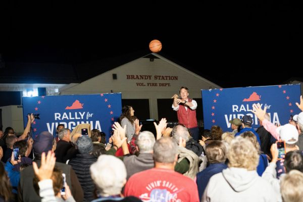 图说:11月1日,在美国弗吉尼亚州一场竞选集会上,共和党州长格伦扬金(右)为共和党竞选人耶丝莉维加助选。(新华社)